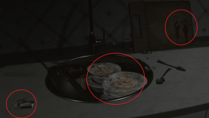 - The concealed matches. This is to the left of the first set of dirty dishes, on the counter beside the oven. Be sure to click them then zoom all the way in. You’ll know that you’ve successfully “obtained” this clue if Wyatt begins a dialogue.