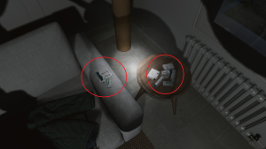 Head into the bedroom and look to the right of the couch. You’ll find a stack of pills on the table bedside the bed. Examine it. Then, turn the camera left to examine the pills on the couch arm. Once you’ve examined both, you’ll pop the achievement.