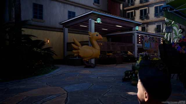 After you’ve collected the second Cactuar, head back to the main street and turn left at the Tourist Information booth. Go up the stairs and then up the cement ramp. Once you see the large Chocobo statue, stop. Turn left and look up.