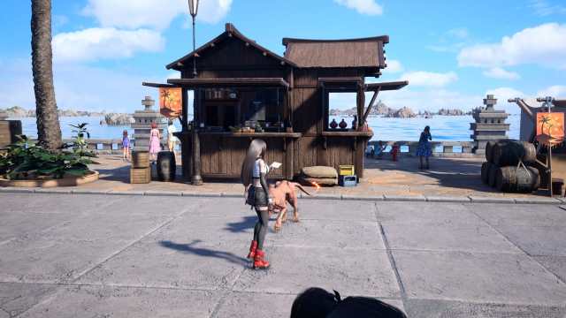 We’ll tackle the most out-of-the-way Cactuar next. Head over to the wharf where the Shinra-8 cruise ship is docked. But we won’t go down towards it. Instead, we’ll stop short. When you see a small shack of a shop, turn left towards the ocean. Head towards the concrete railing.