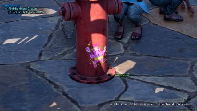 You’ll then need to focus your crosshair on the Cactuar. Once you do, you’ll see numbers pop up to the bottom right of the circle. You’ll then need to use R1/L1 to zoom in and out of the Cactuar. For this Cactuar, you’ll need to zoom in to 70.0. The amount you’ll need to zoom in is determined by the percentage marked beside it on the map, which you can pull up by pressing the left button on your d-pad when you’re not in camera mode. Each Cactuar has a different amount of scope required.