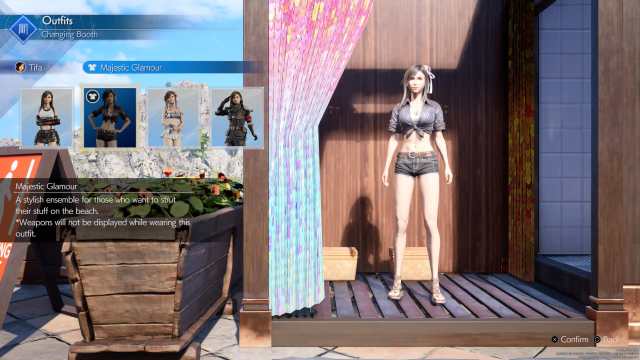 You won’t be able to change your party’s outfits until Chapter 6 when you arrive at Costa del Sol. Once there, you’ll start a main scenario quest line that puts Cloud, Tifa, and Aerith on the hunt for Companion Cards that will let them purchase beachwear.