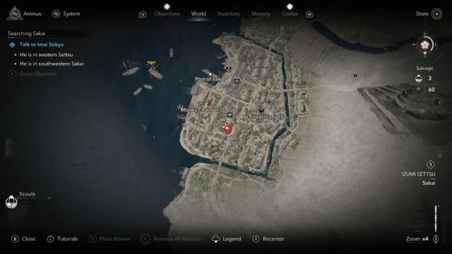 Use your left trigger or L2 to go to Observation mode. You’ll see blue and yellow markers around Sakai. I highly suggest grabbing all the yellow markers, as most of these are resources for your hideout. The blue marker is for your quests, which, in this case, would be Imai Sokyu if you are near him.