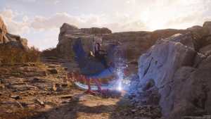 Once you arrive at the site, there are three artifacts to uncover. To find them, get on your Chocobo and press the Up button on the D-Pad when a question mark appears above its head. Pivot your camera with the right joystick until a blue line appears, extending from your Chocobo to the buried treasure. Once you find the treasure, press the down button over top of it to have your Chocobo dig it up.