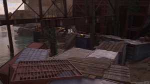 Junon bears the scars of its lost war against Shinra, and none are more prominent than the broken ships that line its craggy coasts. But one ship in particular has multiple caches you can find. There are three caches in total. Two are on the ship’s deck, and one is in the remnants of the cabin. We’ll grab the cabin one first, as it’s closest.
