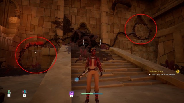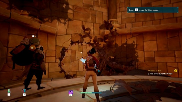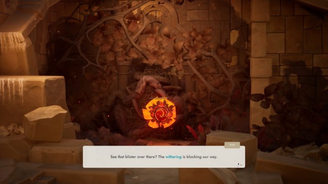 Once you go down, follow the path, and you’ll see a relic. Interact with it, and it’ll cause a withering corruption to spread around the temple. Your new friend will help you out of the predicament, and you’ll return back to where you started in the ruins, but with the withering corruption already causing havoc.