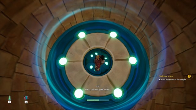 As you are greeted by a friendly but mysterious being, they’ll ask you to explore the ruins. In the first image above, you’ll see an open ledge. Run up to the stairs and jump across. Climb up and follow the path. You’ll see a mysterious platform. Step on it, and it’ll take you down.