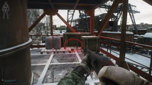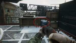 Go up to the third floor and go to the center of the scaffolding near the railing. You’ll see a broken box and this is where you’ll be stashing the DVL-10 Magazine. Again, use the boxes for cover when placing the objective.