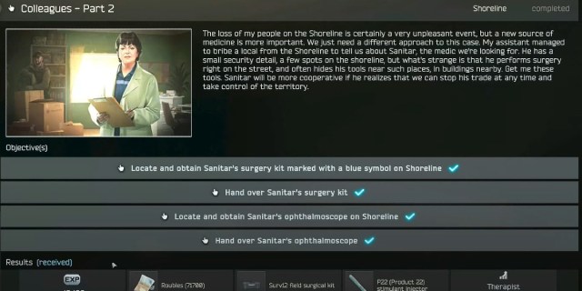 Santiar’s surgery kit is located on the pier, while Sanitar’s ophthalmoscope is inside the locked cottage house near the middle of Shoreline. Both located are quite far apart, so it’ll take roughly 10 minutes minimum to get both tasks done. You can extract one quest item and submit it to the therapist. Then, you can go into a shoreline raid again to finish the other one. However, most players would want to finish the quest in one raid to save time.