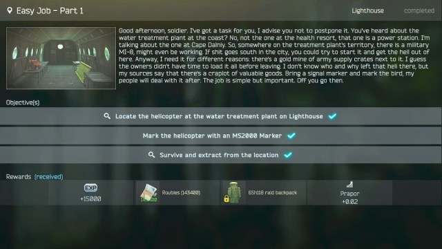 If you die, you can run the raid again and just survive and extract. You can finish other quests like Cargo X Part 4 or Energy Crisis. Finishing multiple quests in one raid is the best way to level up, so it might as well be efficient. Finishing Easy Job Part 1 will unlock the best bag in the game, the 6Sh118 Raid Backpack. It is something that players look forward to when they start their money runs.