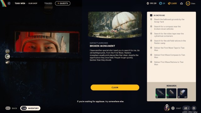 Unlike the First Foothold and What We Left Behind quests, since there’s an “In One Round” marking on the quest, you have to finish the Broken Monument quest in one raid. Based on the objectives, you need three item slots for the videotape, compass, and rations. It is also worth noting that I haven’t tried finishing the quest by delivering the items one by one. Since all the objectives were close to each other, it was pointless to try anyway.