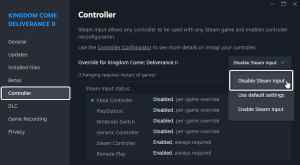 - Select the Controller tab, and select the Disable Steam Input option under Override for Kingdom Come: Deliverance 2
