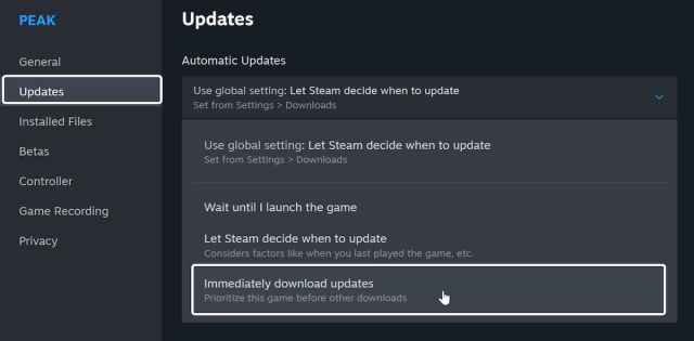 Since this is a game with constant updates, I recommend putting the update priority in Steam to the highest. This way, PEAK will take priority over your other game updates, so you aren’t playing on an outdated version. Here is how you can do that in the Steam client: