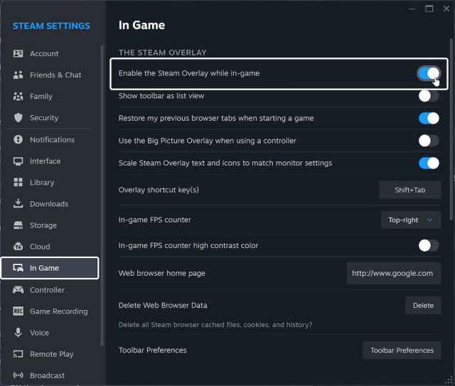 • Toggle the first option on so Steam Overlay is enabled on a global level