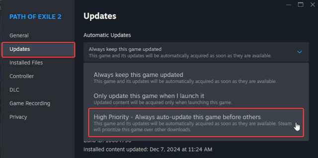 Since the title is constantly receiving patches and updates, we recommend increasing the update priority in Steam. This will ensure that Path of Exile 2 is updated first and that you aren’t behind on an important patch that might include stability improvements.