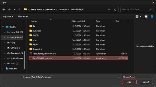 • Head over to where Path of Exile 2 is installed, and select the PathOfExileSteam.exe executable file, which is around 65 MB in size.