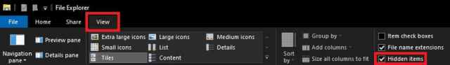 - Within the File Explorer, Select the View tab located just under the top border of the window, and then, from the menu that appears, locate the Hidden Items checkbox and click it.