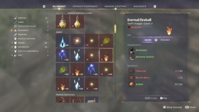 For spells, you are mostly looking at the Fireball II and Eternal Fireball. Eternal Fireball is an infinite Fireball spell, which needs 50 Amber. Since it is an Eternal or infinite spell, you want to prioritize this over the other Fireball spell because it takes 5 Amber to make each Fireball II spell, which is, sadly, temporary.