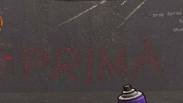 You can’t spray forever, though. You need to paint in short strokes, after which the paint will stop coming out. You then need to press “Q” to shake up the can before you can resume spraying. Sadly, it doesn’t last very long. I have managed to spray about seven big letters with one can, and here’s a screenshot of my vandalism: