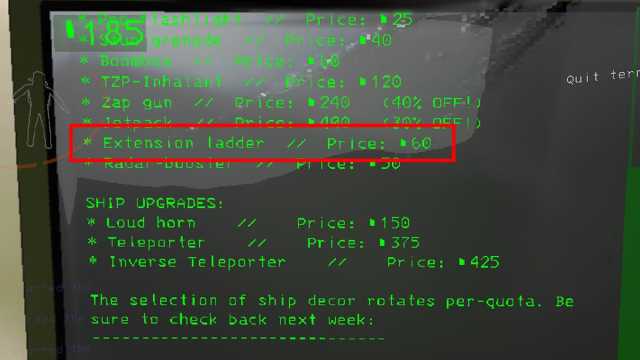 You can buy an extension ladder using your ship’s terminal for 60 scrap. To view the shop’s listings, type store into the terminal before entering extension ladder and confirm. It will appear in your next batch of purchases when you land on a moon.