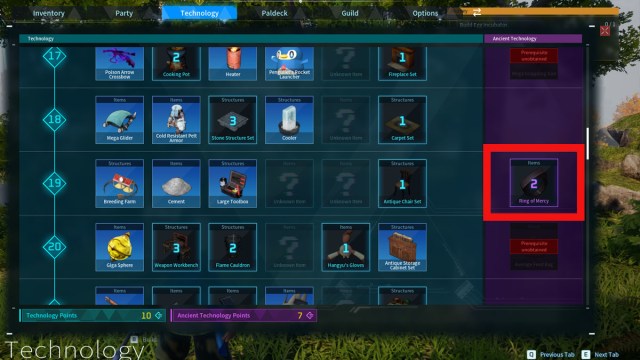 The Ring of Mercy can be unlocked by reaching Level 19 and buying it from the Ancient Technology Skill Tree. It costs two Ancient Technology points, obtained by completing big feats such as defeating bosses or completing dungeons, so you should have plenty of them if you’ve been roaming the world and overcoming its big challenges.