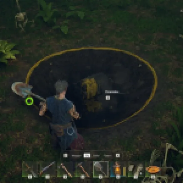 Go to the quest area again and bring out the Shovel. When you bring out the shovel, it has four uses: Weapon, Dig, Raise, and Flatten. Use the dig option by pressing “Z” or “X” and start digging at the center of the dead crew.