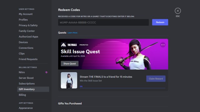 Once the progress bar is complete, click Claim Reward to get the Redeem Code. Next, go to the Embark Portal and log in with your account with which you play the game (Steam, PlayStation, or Xbox). Once there, go to Redeem Gift Code and enter the code you got for completing the quest. If you forgot to copy it the first time, you can always go to the Gift Inventory tab in Discord Settings and click See Code on the Skill Issue Quest.
