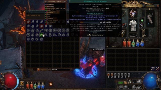 The Withering Touch support gem brings several physical builds to life by transitioning their damage output to chaos in Path of Exile. Withering Touch is more of a niche support skill, as chaos-type builds are quite established already.