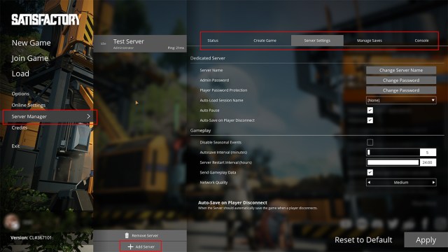 That’s all there is to it! You can now enjoy your dedicated Satisfactory server, and your friends can join by heading to the Server Manager section on the main menu and adding your server to their own lists by entering your External IP address. Keep in mind that you must keep the Satisfactory Dedicated Server client open at all times for your server to stay online, but you can close the actual game client at any time.