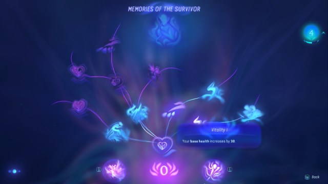 The second way to permanently increase your health in Avatar: Frontiers of Pandora is to select the Vitality skill line under the Memories of the Survivor skill tree. Each Vitality skill you invest points into increases your base health by a specific amount, with the first offering granting a +30 point increase.