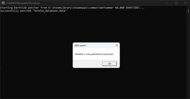 • After that, you’ll get a confirmation that “Darktide is now patched to load mods