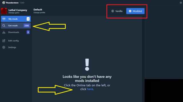 After getting the mods you want, you can click on the “Modded” play button in the window’s top-right corner.