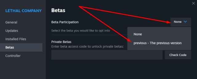In case after a patch of Lethal Company, old mods don’t work, you and your crew should revert back to the previous version of Lethal Company. Right-click on Lethal Company on Steam, hit Properties, and switch back to the old version from the “Betas” section: