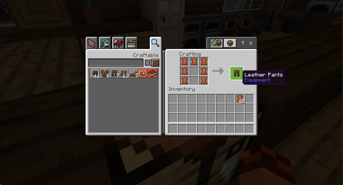 Leggings are made similarly to helmets; however, they require the full outer length of the Crafting Table so that they form an upside down ‘U’, much longer than the helmet but following the same format.
