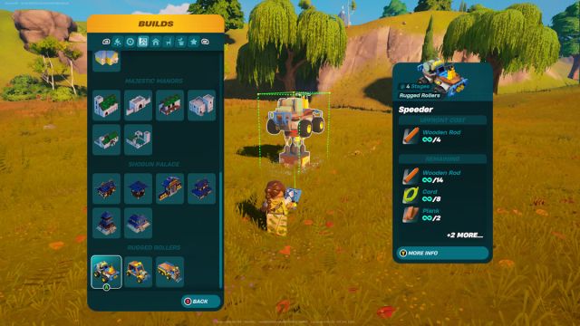 While players have access to individual vehicle parts to make their own car how they want it, players can simply pick the car they want and be assisted in building it just like any other building. The cars can be found under the Rugged Rollers section in the Builds tab of the Build menu.