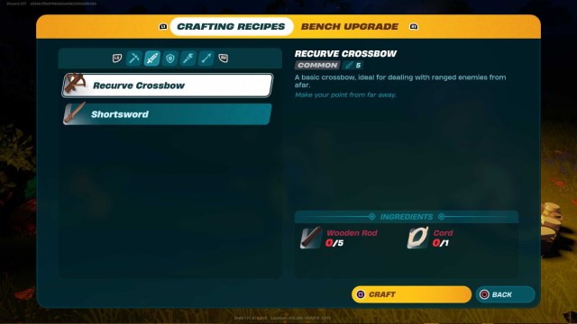 To craft a weapon of your own, you’ll first need to create a Crafting Bench. Once you have found the exact spot you’d like to place it, build it and get ready to get to work. Approach the crafting bench and use the button displayed on the screen to start creating your new weapons.