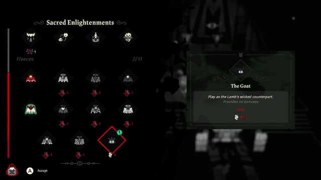After you unlock The Goat fleece, you can equip it to turn into the Goat character in Cult of the Lamb.