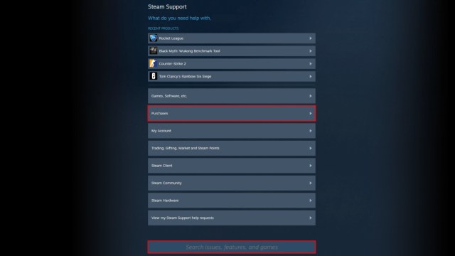 - Click on Purchases to view the recent products you purchased, or type in the name of the game you want to refund.