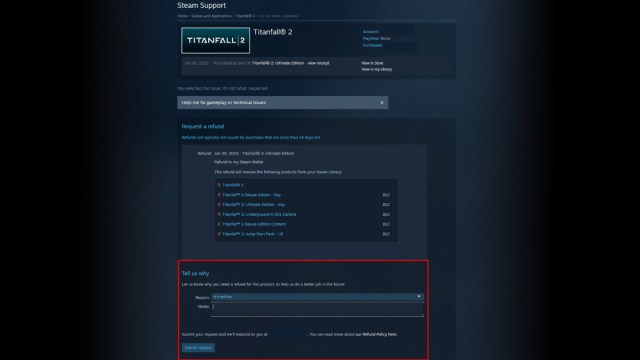 - From the dropbox menu at the bottom, select the reason for the refund and write a note to let Steam know the exact reason for requesting a refund.