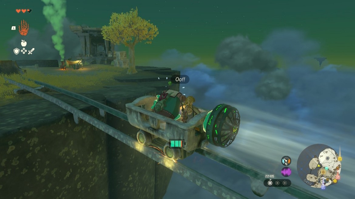 Once assembled, the minecart with the Zonai Fan strapped on the back should be placed on the rails using Ultrahand, then use the same skill to pick up the Korok by grabbing its backpack and placing it in the cart. Now all that’s left is to jump into it with Link and hit the Zonai Fan with your weapon to activate it. When the cart transports you to the other side, jump out and use Ultrahand again to pick up the Korok and drop it near its friend, who is nearby under a makeshift tent.