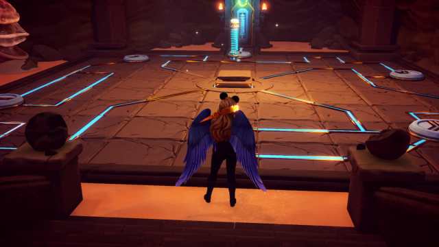 Next, you’ll have to head up the stairs to your right. In this room, you’ll find a power coil in the center, with several circles on the floor. Your goal is to turn each circle so the lit power coil’s electricity can flow through the wires on the ground. Below are the steps to finishing this:
