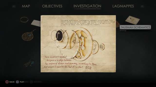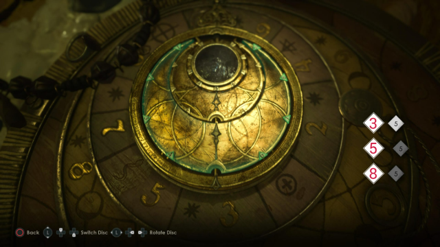 Interact with the plate on the table, and Emily will immediately place the Talisman on the plate. From here, you’ll need to move each of the three discs’ so the code “358” lines up. We know this thanks to Jeremy’s note, which was nearby. If you look closely at the note, you can see three numbers circled on the talisman. This shows what order you should input the numbers.