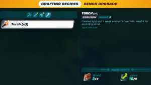 The next item you can make is a torch, which you can make at a crafting bench using three wood and five vines. Vines are another early-game resource you can collect from bushes. Bring these items to your crafting bench to make three torches, which you can carry around for a portable source of warmth.