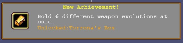 Unlocking Torrona’s Box is a relatively simple task, and consists of you having six different evolved weapons during a single run. This means that you should pick a character that has an upgradeable weapon (see our Vampire Survivors weapon upgrade guide here). Basically, the idea is to pick any of those weapons but to also pick up Passive items that align with the upgrade requirements. If you happen to accidentally click a wrong Passive, you’d better be having an appropriate item to pick up as the seventh passive because you can bypass the limit if you pick up the item after you have learned all 6 by leveling.