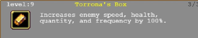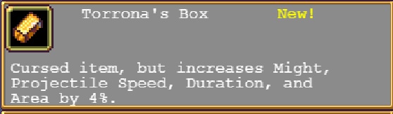 Basically, the Torrona’s Box starts out on a pretty positive note, giving your a 4% bonus on your Might, Projectile Speed, Duration, and Area on Level 1. Levels 2, 3, 4, 5, 6, 7, and 8 give 3% each to the same stats (25% total), while the last level raises your Curse level by 100%. Try not to level it too early and leave some space for random level-ups from chests to not get wrecked immediately.