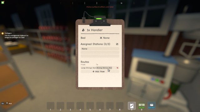 My strategy is to have an exclusive large storage rack and mixing station for each mixing ingredient. If you have eight different mixes for your final product, you’ll have eight storage racks filled with each ingredient and eight mixing stations. I’d hire two handlers in this scenario, four racks and mixing stations each. Don’t mind the assigned stations section on the clipboard for the handlers, as those are for packaging.