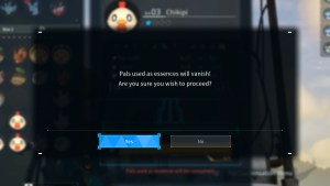 Make sure that you’ve selected the right pals to sacrifice. You don’t want to send them off to the great beyond with no way to recover them, especially if you accidentally grabbed one that is more powerful than expected. You’ll get a prompt to warn you that there is no way to get them back, and once you select yes, you’ll have a newly powered-up Pal.