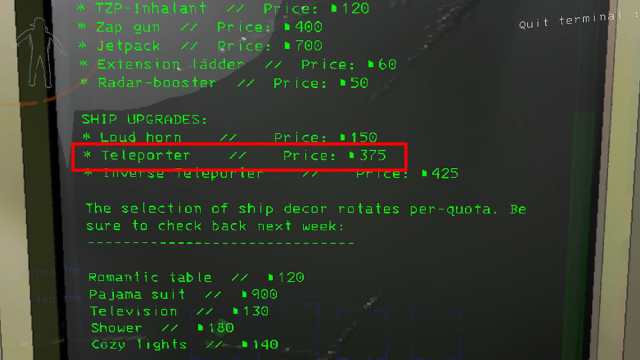 The teleporter is available in your ship’s terminal store under Ship Upgrades for 375 scrap. To find this shop page, enter your terminal, type store, teleporter, and confirm.