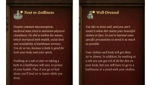 | Next to Godliness | Washing at a tub or pier or taking a bath in a bathhouse will cure 10 points of health. Plus, if you go to bed clean, you’ll heal 25% faster while you sleep. |