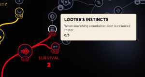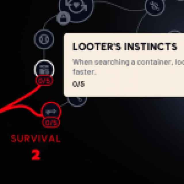 You can dump 5 points into this, making the “reveal” part go a bit faster than the default. This lets you see what’s in the container, so you can make quicker decisions about what to move to your inventory. You can also put points into the Silent Scavenger skill to reduce the noise you make while looting.